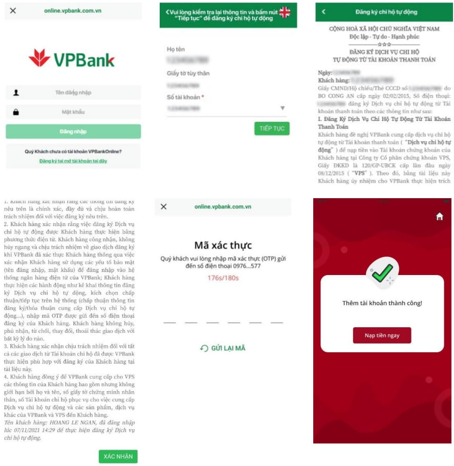 - Chọn tài khoản VPBank, kiểm tra thông tin tài khoản và bấm Tiếp tục