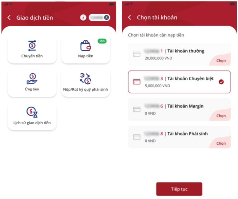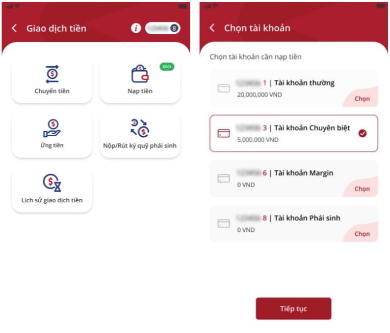 - Chọn TKCK mà Quý khách muốn nạp tiền và bấm Tiếp tục