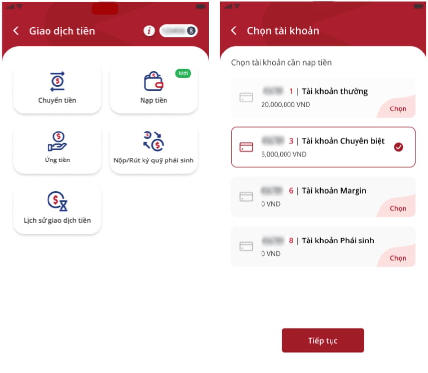 - Chọn TKCK mà Quý khách muốn nạp tiền và bấm Tiếp tục
