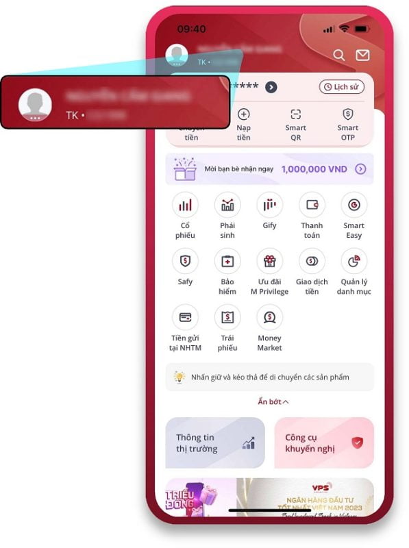 1.1 Tại màn hình Trang chủ ứng dụng, nhấp vào cụm thông tin cá nhân (Họ và tên/ Số tài khoản) để truy cập màn hình “Thông tin tài khoản