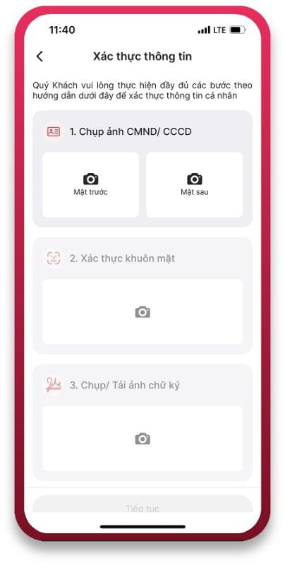 Tại màn hình “Xác thực thông tin“, thực hiện đầy đủ các bước theo hướng dẫn để xác thực thông tin: